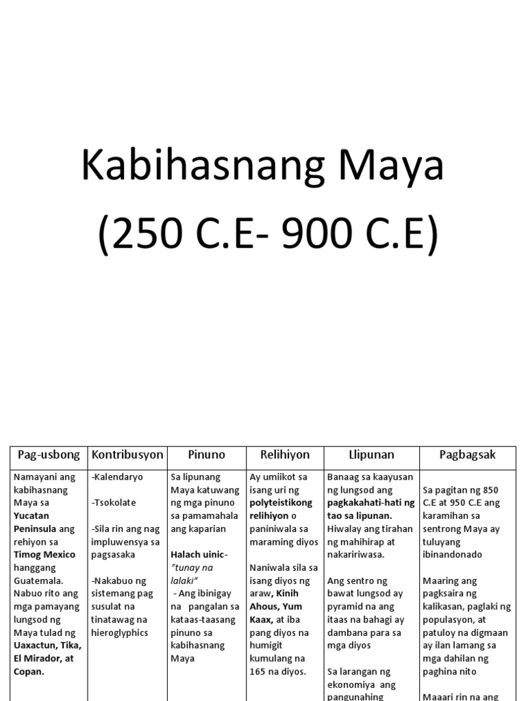 Human sacrifice has been practiced in various cultures throughout history. Gawain sa Pagkatuto Bilang 4. Ang pag-iral ng kultura ng kabihasnang Maya sa kabuuan ay nagtagal mla 500 BC hanggang 900 CE.