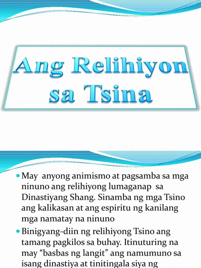 Dahil ito ang nagsisilbing tagapag-isa sa mga Tsino sa kabila ng iba-iba. Sistemang pang- relihiyon 17. Paniniwala sa kabilang buhay sa pagsasagawa ng afterlife sacrifices and offerings.